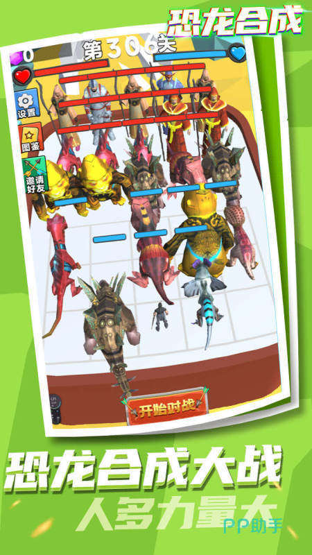 《恐龙合成》今天你可以运用各式的装备,将恐龙武装到牙齿,在地图中进行一场心弦紧绷的生存对抗,通过游戏中设计的恐龙图鉴,我们可以轻松获取各种恐龙蛋,并进行育成以及合并,而且还新意迭出的,采用了团队式的作战机制,你可以尝试将整个队伍的恐龙进行逐一的高等级合并。
