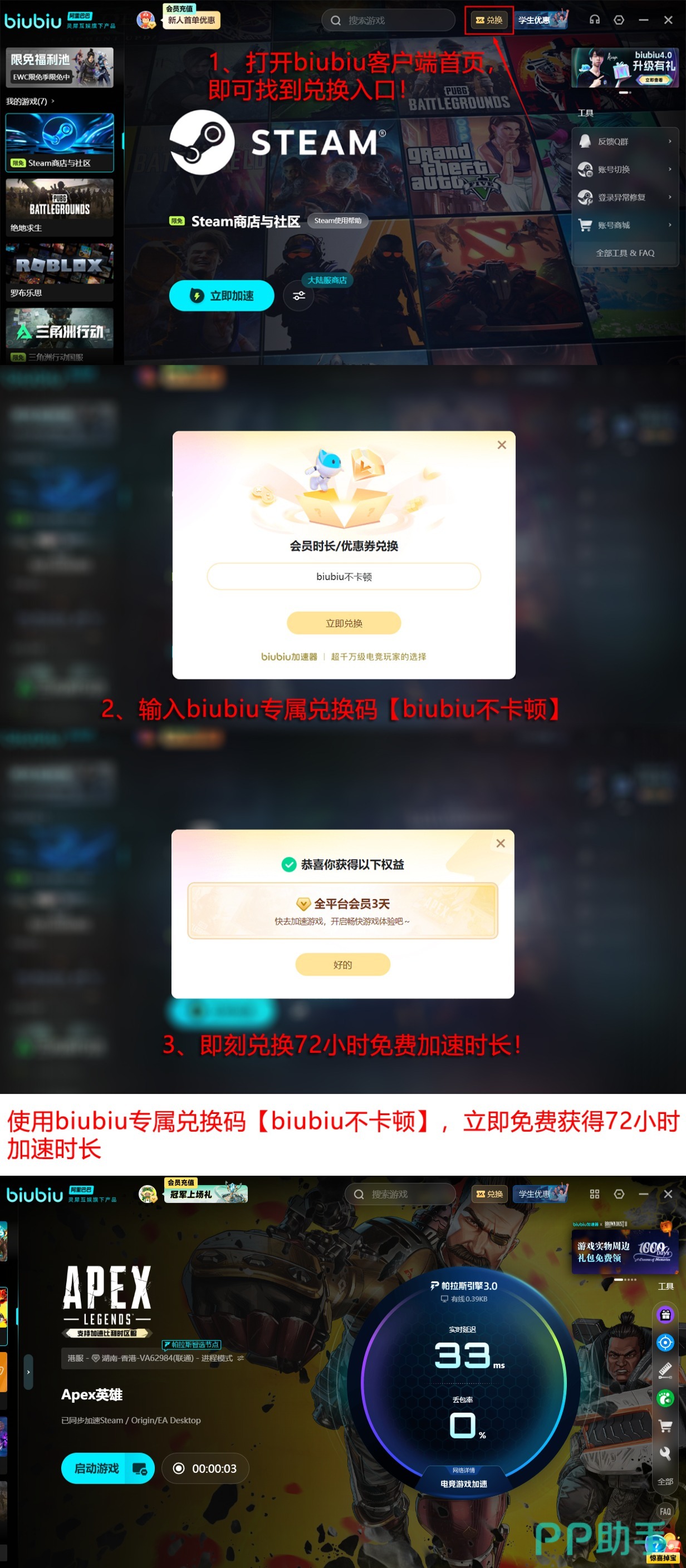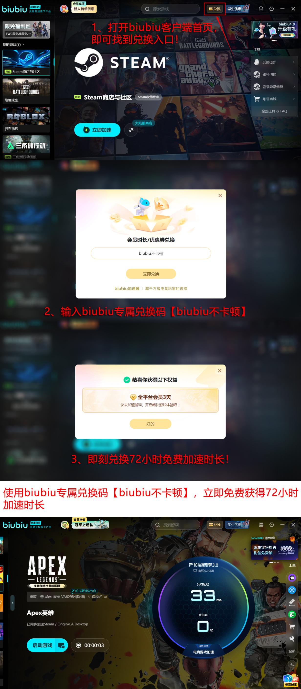 为降低新老用户使用门槛,biubiu提供双重福利支持:新注册用户首次登录即可自动激活24小时全节点加速权限;所有用户(含存量账号)均可通过客户端内“兑换码”功能,输入口令【biubiu不卡顿】,免费领取72小时VIP加速时长,总计可达96小时连续服务。