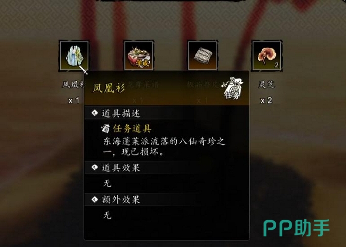 除用于修复“凤凰衫”外,“龙涎香囊”本身亦为碧海仙踪DLC主线推进的重要信物,与瀛洲商人剧情深度绑定。获得该道具后,请及时检查任务日志是否更新对应线索;若未同步出现新指引,建议重返八仙渡、仙人渡等已探索区域进行二次排查,避免支线遗漏。