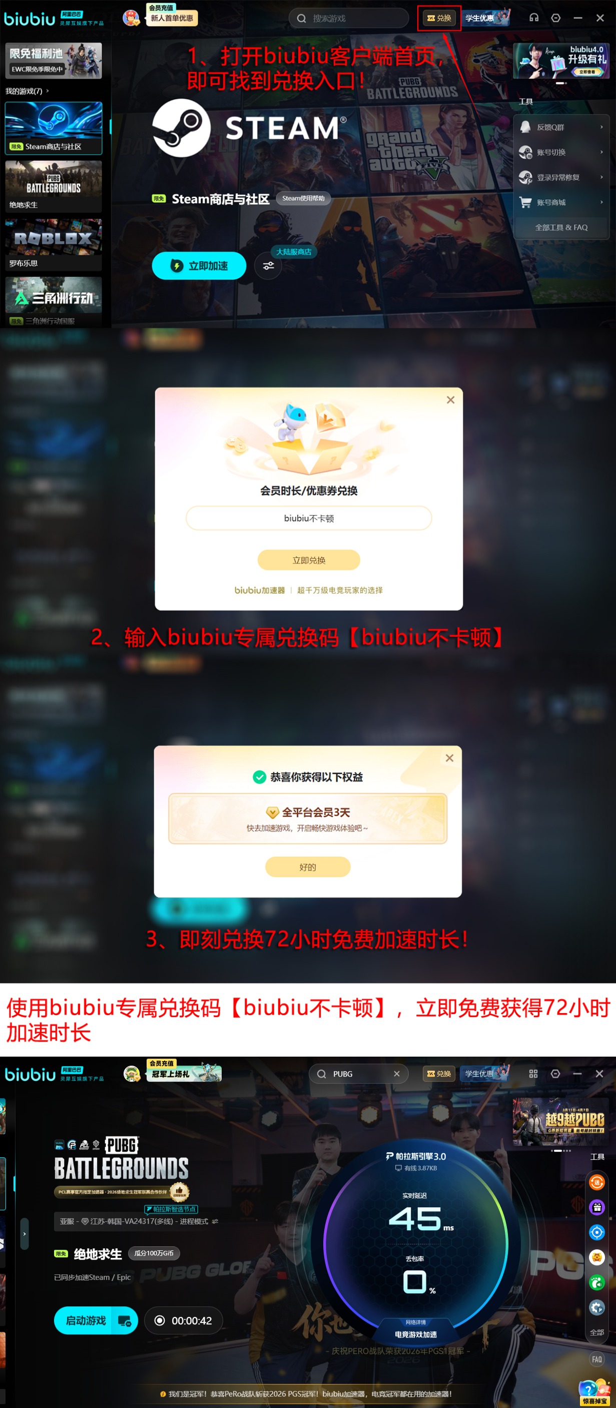 目前biubiu加速器面向新用户提供多重福利支持:首次注册并登录账号,即可自动获得24小时全平台游戏加速权限;所有用户均可凭兑换码【biubiu不卡顿】领取72小时免费加速时长,覆盖PC端PUBG及其他主流联机游戏。