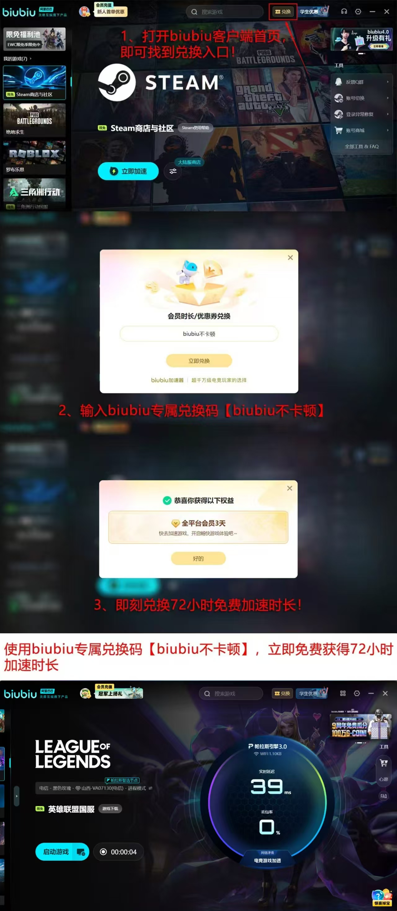 目前biubiu加速器面向新用户提供双重福利机制:注册并首次登录即可获赠24小时全游戏免费加速权限;老用户凭兑换码【biubiu不卡顿】可额外领取72小时加速时长,累计达96小时零成本体验。会员套餐方面,季卡、年卡及双年卡均设有阶梯式优惠,订购周期越长,单日平均成本越低。