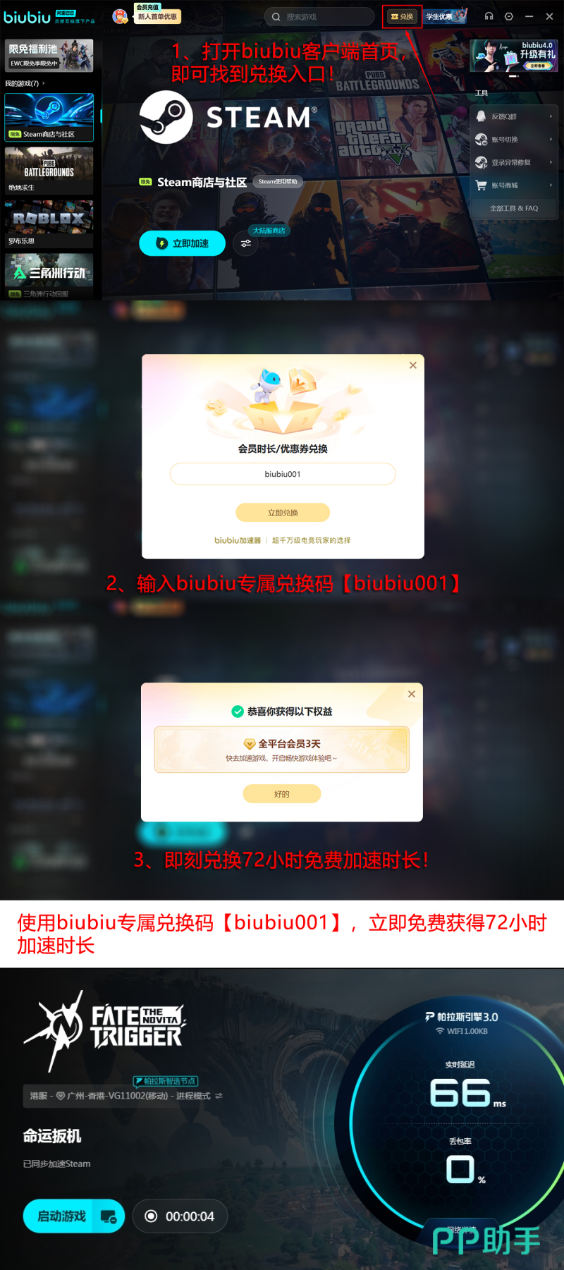 目前平台开放多项免费加速权益。所有用户均可申领基础加速时长,新老用户输入兑换码【biubiu001】即可获赠3天免费加速服务;首次注册的新用户还可额外领取24小时专属时长。两项叠加后,总计可享96小时无压力加速体验,充分满足中长期游戏需求。