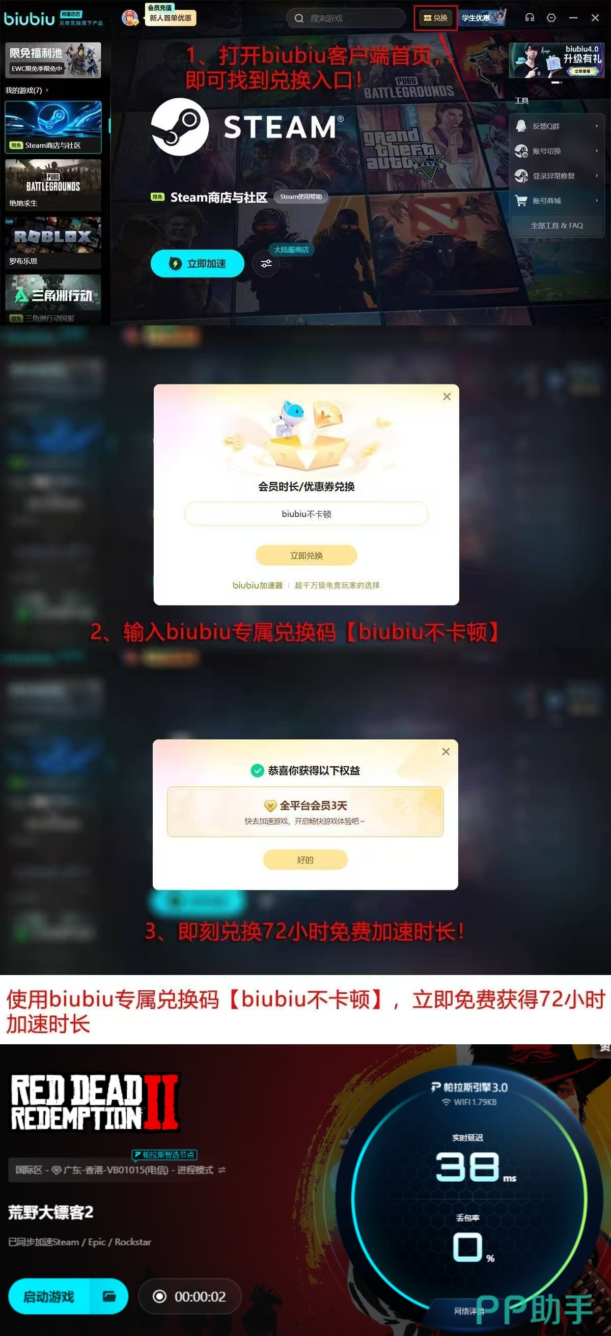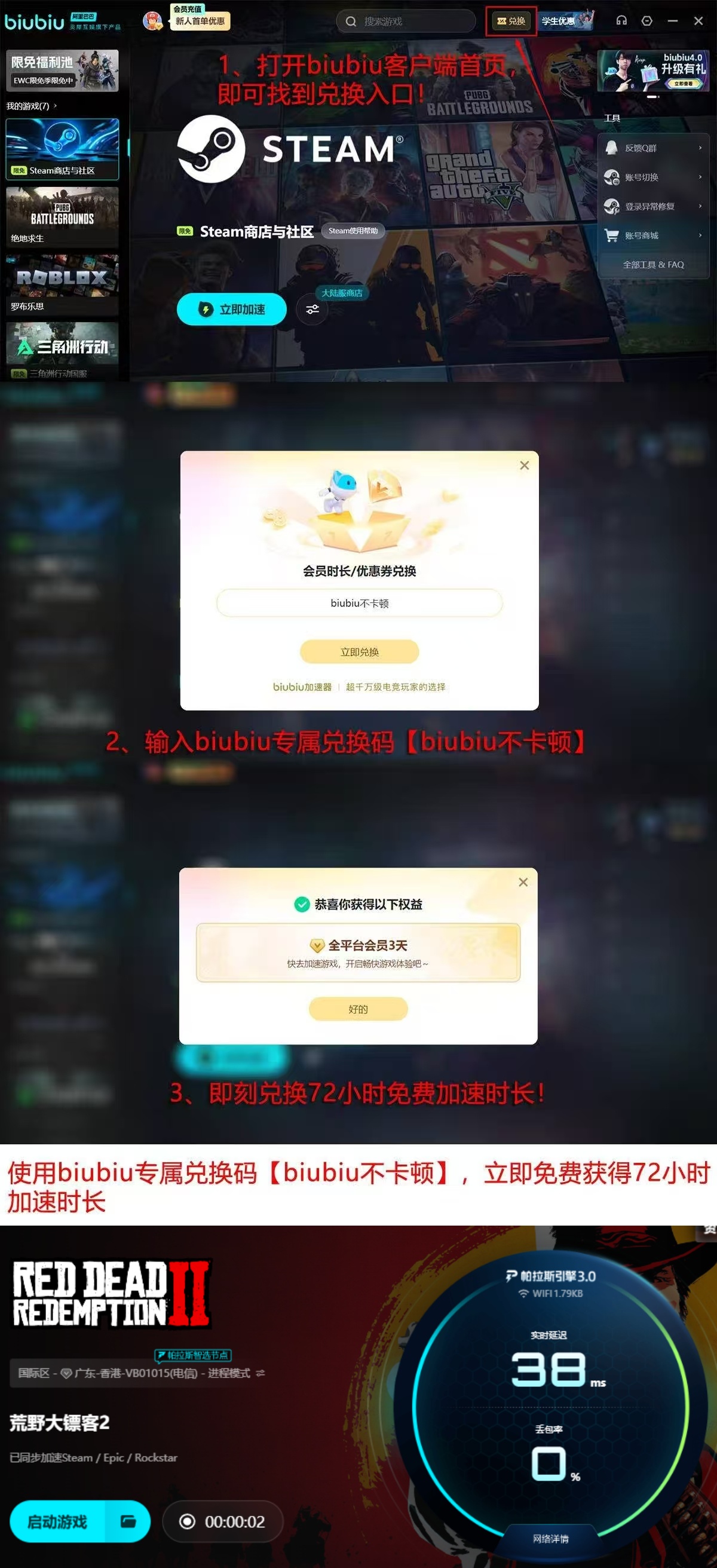 新用户可享无障碍体验权益:完成账号注册即刻激活24小时全功能免费使用权,输入激活码【biubiu不卡顿】额外获赠72小时加速时长,累计达96小时免付费试用期,无需绑定支付方式。