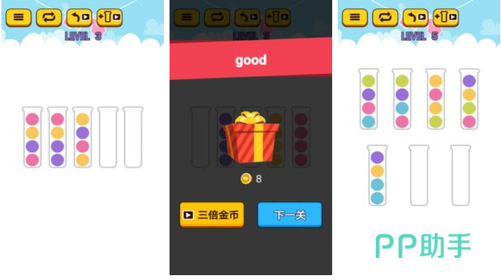 本作就是款利用小球排序的方式进行闯关的休闲手游,玩家要尝试在试管中不断切换小球球的位置,让颜色一样的小球落入同一个容器中就可以通关,整体节奏很快而且玩起来极为烧脑,五颜六色的小球球看上去也十分精致美观,游戏画面生动小清新而且整体也有着超高的耐玩性。