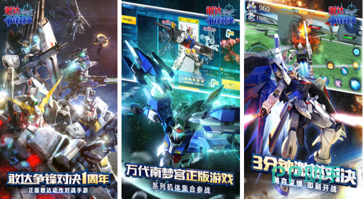 对于机甲格斗游戏爱好者来说,敢达争锋对决这款APP绝对是3A大作,玩家可以真实驾驭高达战士完成公平的厮杀对抗,三分钟即可完成战斗任务刺激性直接拉满,周年庆和日常活动的加持吸引到更多玩家,经过高达动漫正版授权的好玩内容也极为有趣,满屏的日漫机甲元素让高达粉丝着迷。