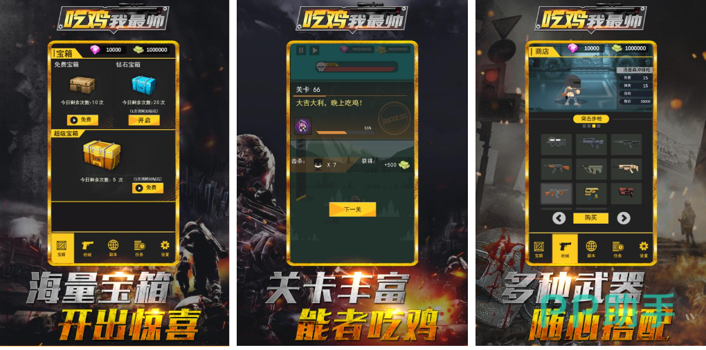 吃鸡我最帅是款可以单机挑战的闯关类型吃鸡游戏,吃鸡战斗的理念特立独行也有着许多武器,海量宝箱都可以随意解锁获取更多资源,还可随心搭配配件让武器看上去更加霸气,超酷的吃鸡战斗过程给玩家提供的新鲜感不错,优秀的视听反馈加上特殊的吃鸡效果让大家感到很新颖。