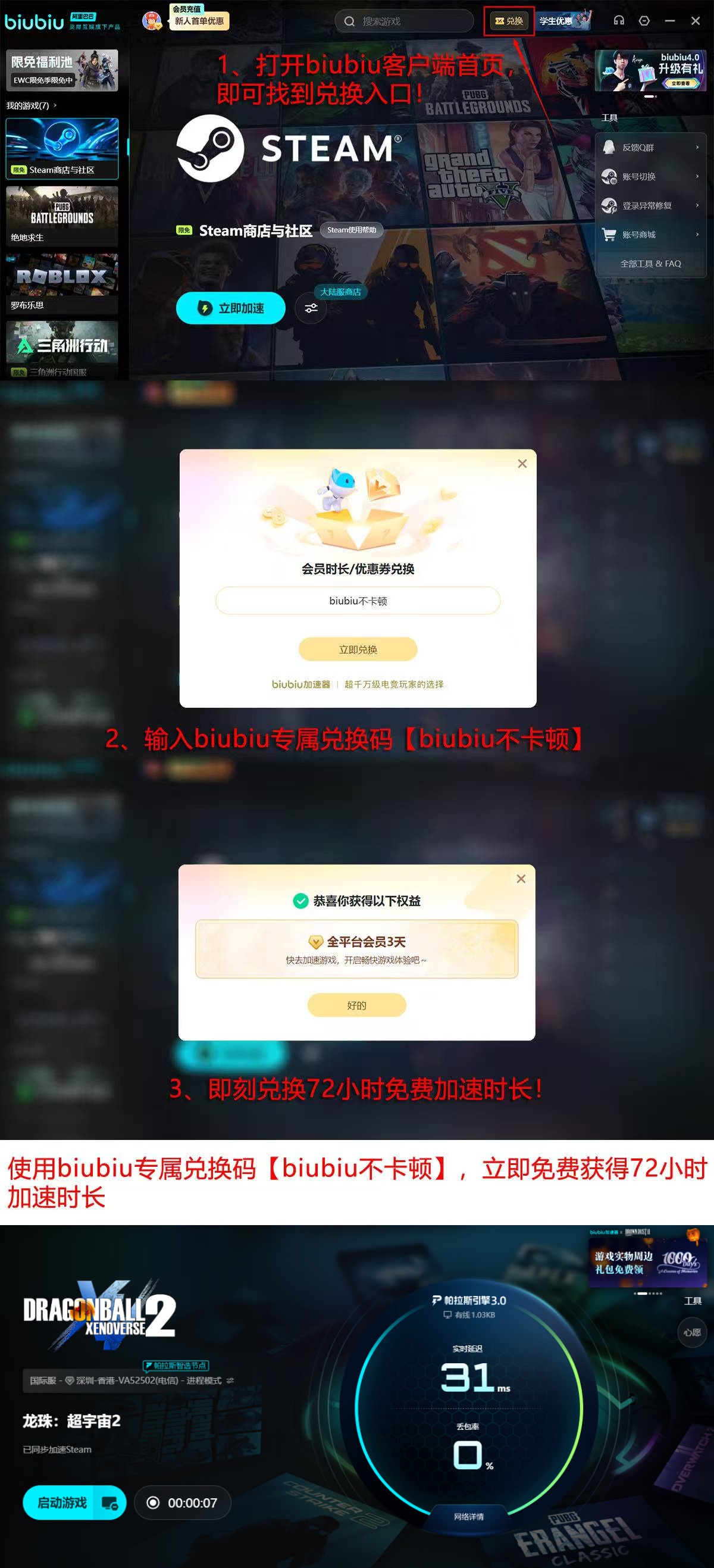 新用户注册即赠24小时全游戏通用加速时长,覆盖PC、主机及移动端主流平台。额外福利:所有用户(含已注册账号)输入兑换码【biubiu不卡顿】,可即时领取72小时专属加速权益。限时开放,建议及时兑换使用。
