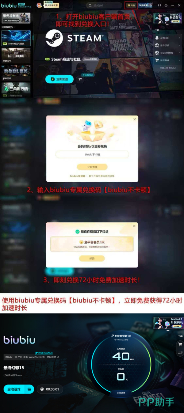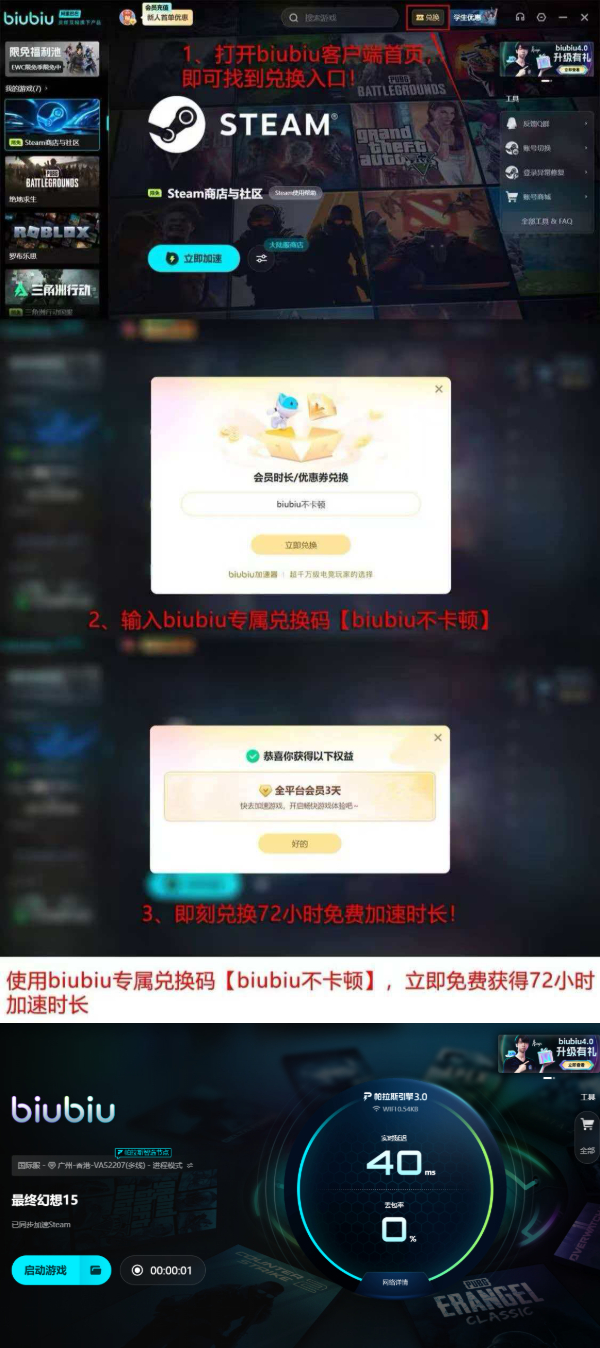 目前新用户注册即可获赠24小时全功能加速时长;输入专属口令【biubiu不卡顿】,额外领取72小时权益,累计达96小时免费使用额度。