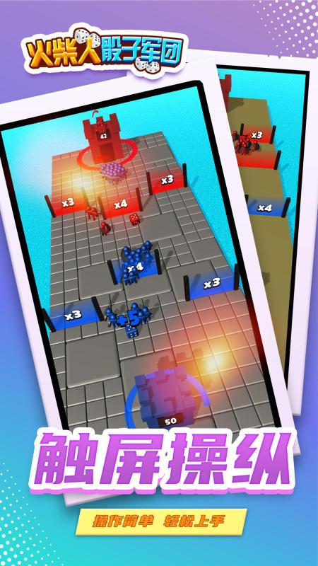 本作以火柴人题材为基底,构建快节奏军团对抗玩法。核心创新在于实时骰子召唤系统——战斗中可随时触发摇骰操作,依据点数即时生成不同兵种单位。每位士兵携带属性增益,配合地图上分布的高危地形障碍(如灼烧区、落石带),形成攻防节奏高度动态化的战场环境。