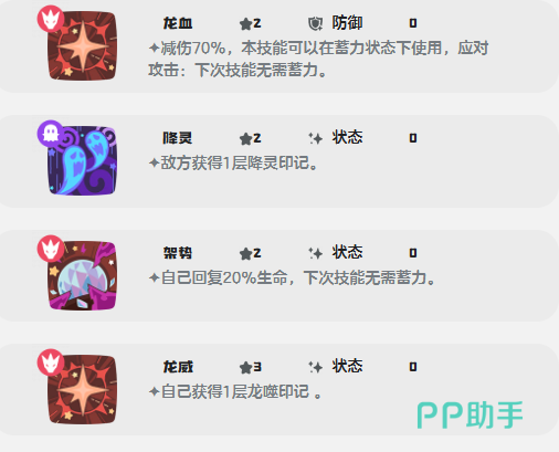 输出体系以“坟场搏击”为核心爆发技,基础威力180,属高耗能高回报型技能,需结合敌方能量状态择机释放;配合“架势”类技能提供的回血与免蓄力效果,可完全规避传统蓄力短板,实现无缝连招。另一主力技能“龙之利爪”拥有130物攻威力并附带50%吸血效果,适用于持久消耗战。辅助维度上,“龙血”与“虚化”均可提供70%减伤,“锐利眼神”则可使目标双防下降120%,形成高效压制链。