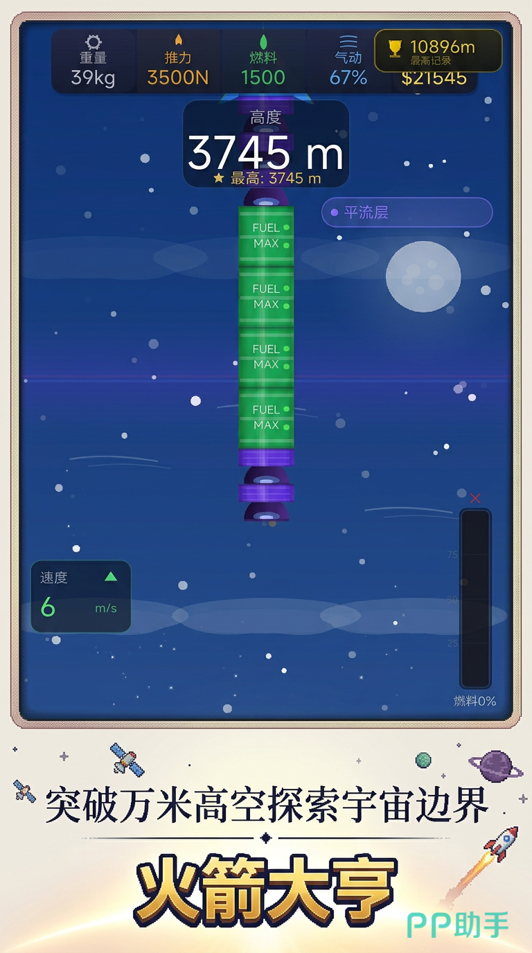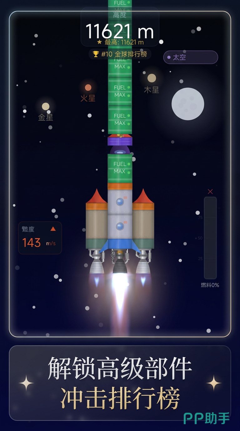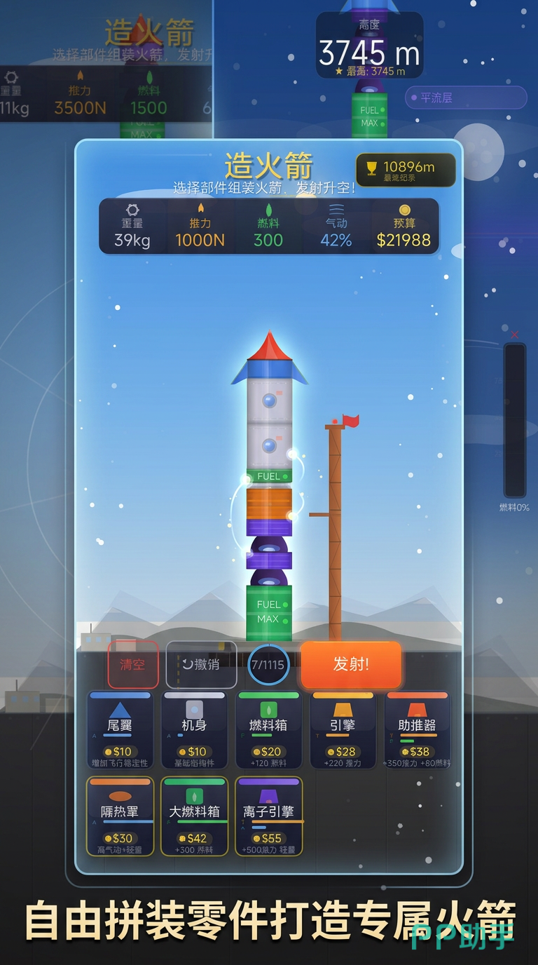 每次进入组装界面,屏幕顶部实时显示当前火箭总质量、理论最大推重比、预估升限及结构稳定性评分等关键指标。玩家可据此动态替换部件、优化配重分布或调整级间分离逻辑。确认无误后,一键触发点火程序,目送火箭穿越大气层,直冲云霄。游戏内置动态排行榜系统,自动记录并同步每位玩家单次发射所达到的最高海拔数据,支持横向对比与历史回溯,激励持续迭代优化设计方案。