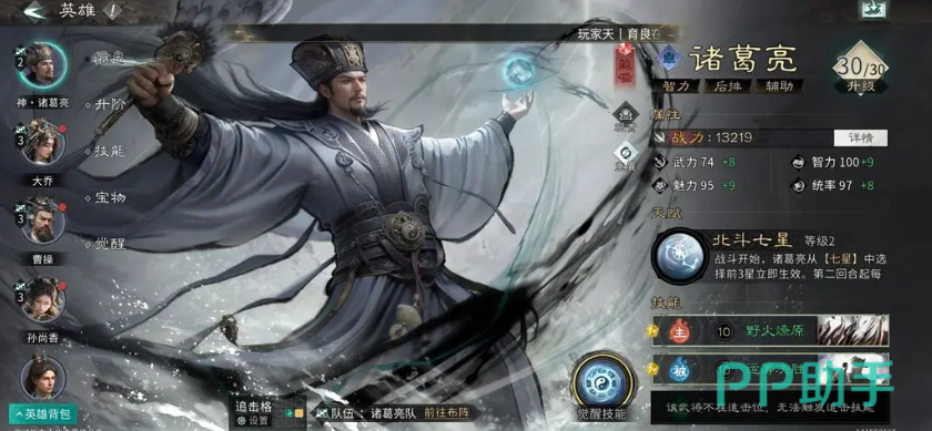 诸葛亮是谋略系武将中机制最立体的一档。其核心优势在于多段式回合控制:每回合自动触发天赋效果,可生成额外行动机会、施加敌方属性削弱,并提升自身踩中追击格后的追击概率。星辰系统进一步放大其功能性——“天权”强化我方整体出手频次;“天机”在受击时激活反伤被动,形成生存反制;“摇光”则直接压制敌方技能释放成功率,属于高覆盖率的软性减益。这种复合型能力结构,使其在PVE推图与PVP节奏战中均具备不可替代的战术支点价值。