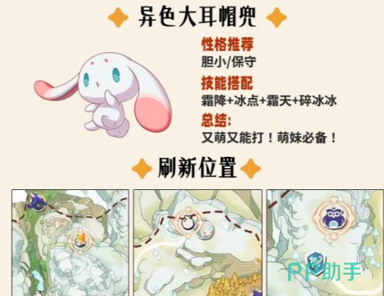 若偏好高颜值与法系输出兼备的精灵,异色大耳帽兜值得重点关注。该精灵形象清新灵动,兼具视觉亲和力与实战强度,深受萌系风格爱好者青睐。其刷新点分布在岚语峰顶部、雪山Boss附近以及悬崖传送点周边。与前两者不同,该精灵以法术输出为核心定位,性格推荐胆小或保守,技能组合建议选用霜降、冰点、霜天与碎冰冰,构成完整的控场—输出闭环,面对被冰系克制的目标时,往往能实现高效压制甚至一击制胜。