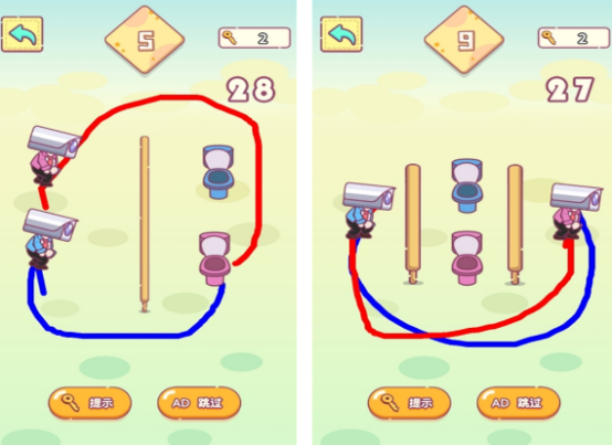 这款比较休闲的,需要在匆忙找厕所的过程当中,解决沿路上所遇到的麻烦、经历,甚至是障碍。需要玩家规划好合理的路线,快速冲向厕所,才能完成厕所大作战这方面的挑战。在体验的时候,大家可以看到画面设计风格特别的简约,由于马桶与游戏当中的主角距离有一些区别,还会有不同的障碍,所以要利用划线的方式,顺利地帮助与马桶一样颜色的人物进行连接。