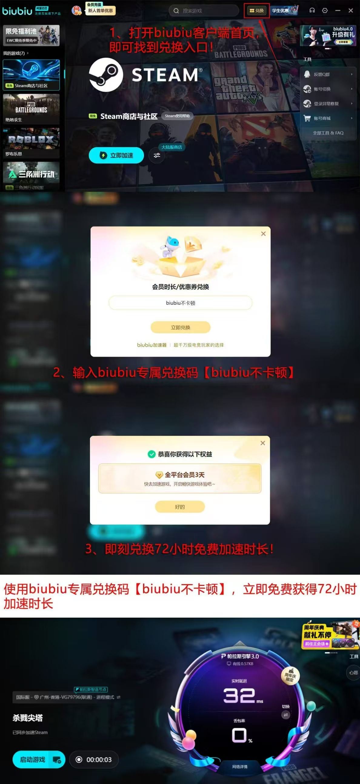 新用户注册biubiu加速器账号之后可以得到24小时的免费试用期。并且输入兑换码【biubiu不卡顿】之后可以得到72小时的免费加速时间,覆盖完整新手引导周期及多轮高难度塔层挑战。该服务对构筑流、诅咒流、遗物协同流等各类主流玩法均提供无差别网络保障,确保每张卡牌的触发判定、每次骰子的随机结果、每回合的行动顺序均严格按服务端逻辑同步执行。