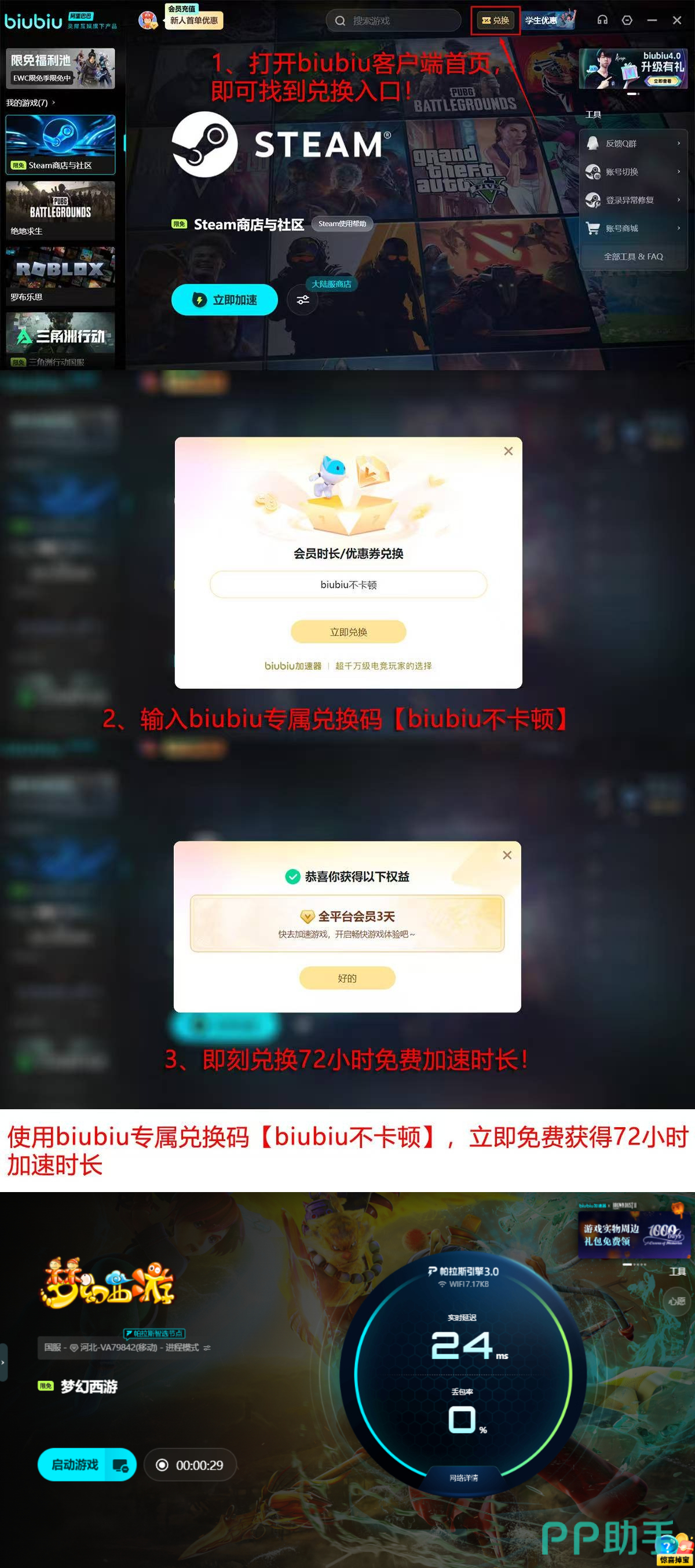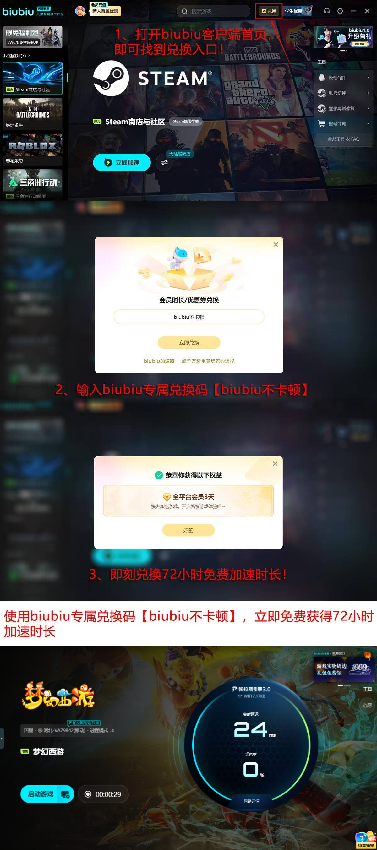 新用户可零成本完成全功能体验:完成注册即获24小时完整权限试用;输入激活码【biubiu不卡顿】还可额外领取72小时加速时长,总计96小时免费服务周期。该时长足以覆盖跨服PK、周末合服、节日限时活动等全部高压力使用场景,便于用户客观评估其在不同网络环境下的实际表现。