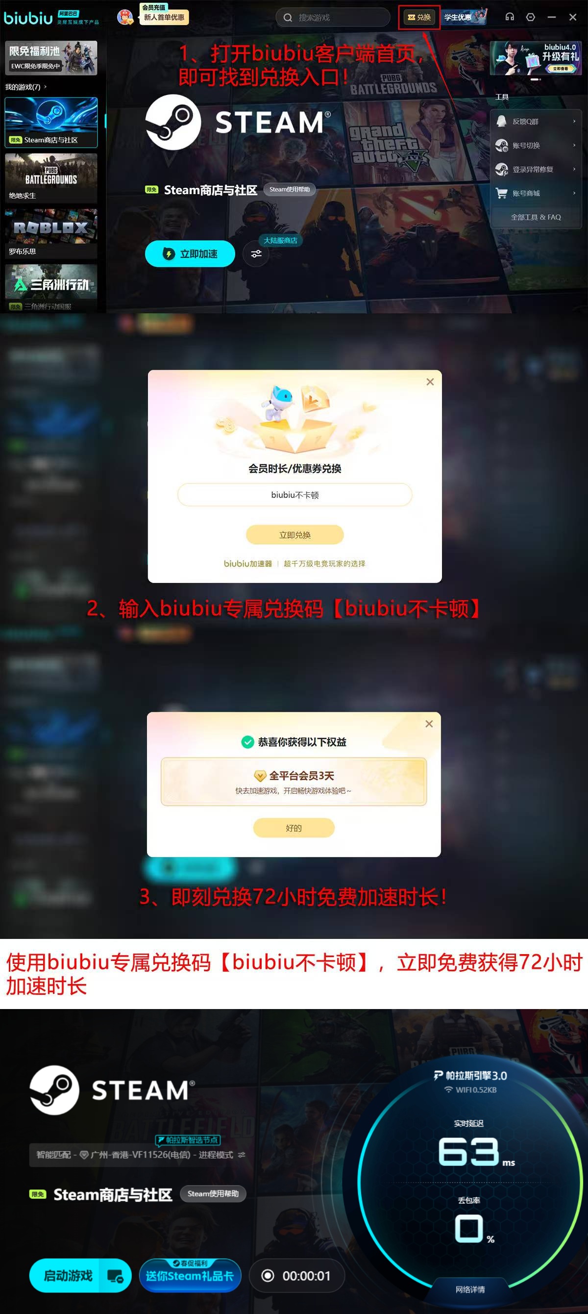 新用户可零门槛体验完整功能:完成首次注册后自动获赠24小时免费加速时长;登录客户端并输入专属兑换码【biubiu不卡顿】,额外解锁72小时加速权益,总计享96小时全功能免费使用期。当前支持《永劫无间》《绝地求生》《命运2》等数百款主流联机游戏的全模式加速,覆盖匹配、组队、语音及实时战斗全流程。