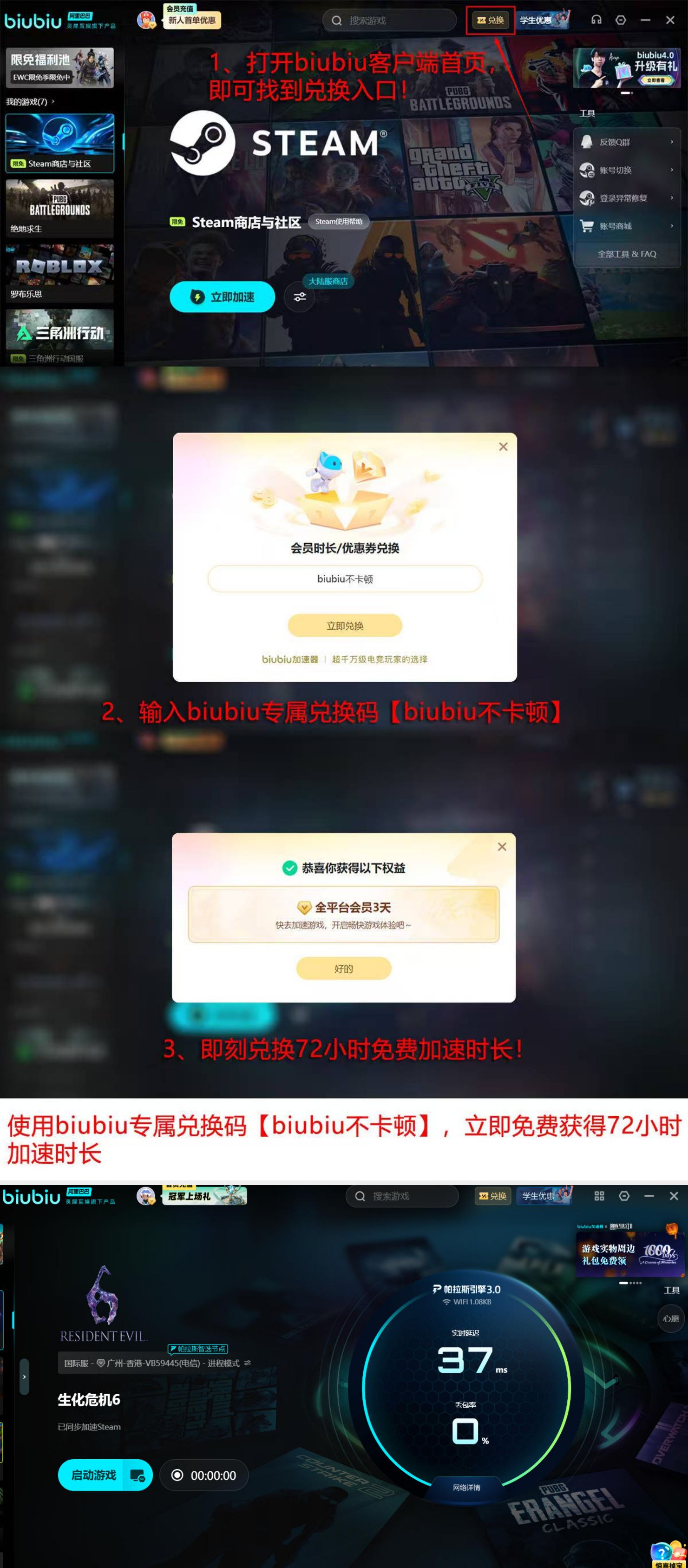 新用户注册登录后即可获得24小时全功能免费加速时长;完成首次使用后,输入兑换码【biubiu不卡顿】还可额外领取72小时,总计96小时有效时长,足以支撑完整通关流程。