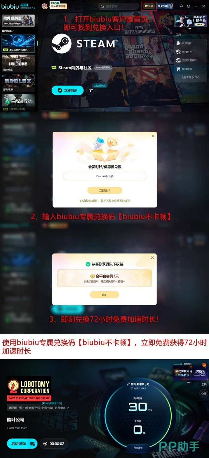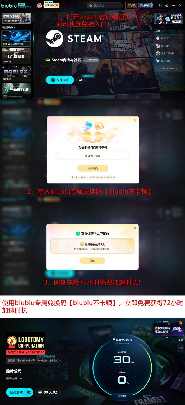 为降低用户试错成本,biubiu提供零门槛体验机制:新注册用户登录后自动激活24小时全功能使用权;到期后可凭通用口令“biubiu不卡顿”额外领取3日加速权限,该口令面向全部用户开放,不限新老。综合计算,首次使用用户可累计享有总计96小时的无限制加速服务周期。