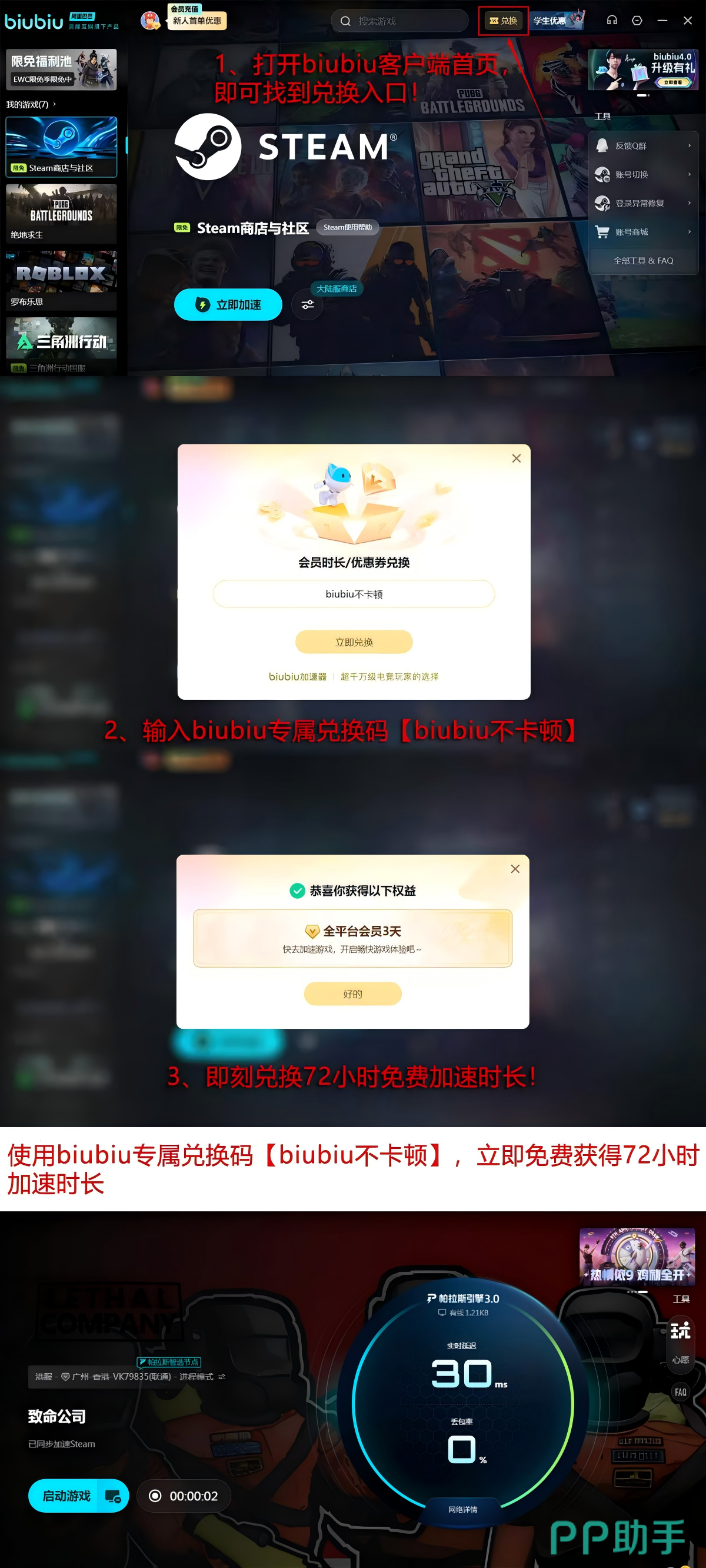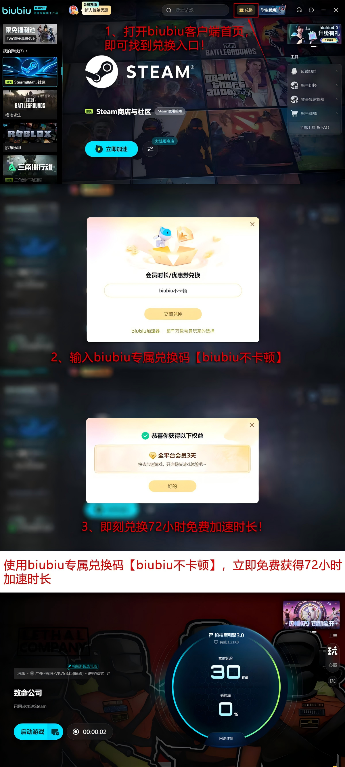 当前新用户注册即可获得24小时免费加速时长;另输入专属口令【biubiu不卡顿】,还可额外领取72小时服务权益,两项叠加最高可享96小时连续使用权限,助力玩家快速接入游戏环境。