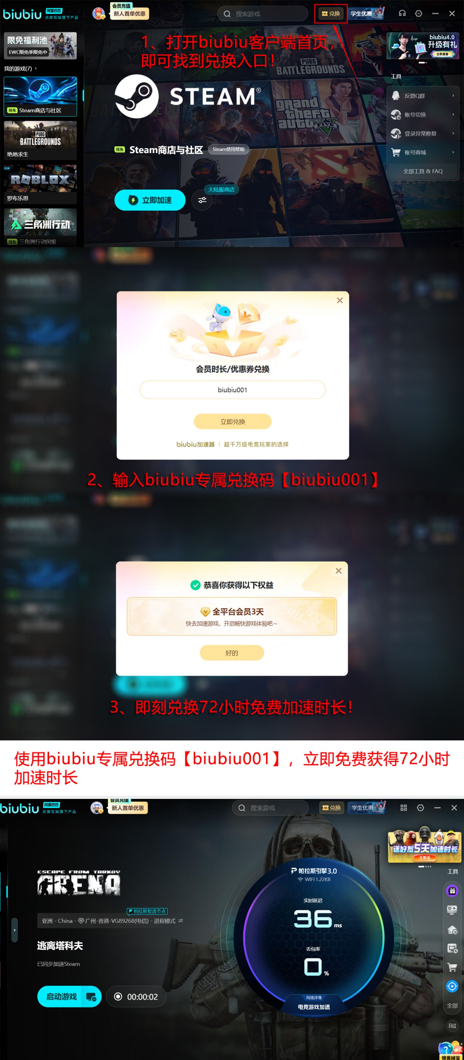 目前平台面向新用户提供无门槛试用权益:完成下载安装并注册账号后,即可立即启用24小时免费加速服务。试用期内若体验满意,可凭专属兑换码【biubiu001】额外领取72小时加速时长,两项福利叠加总计可达96小时免费使用权限。
