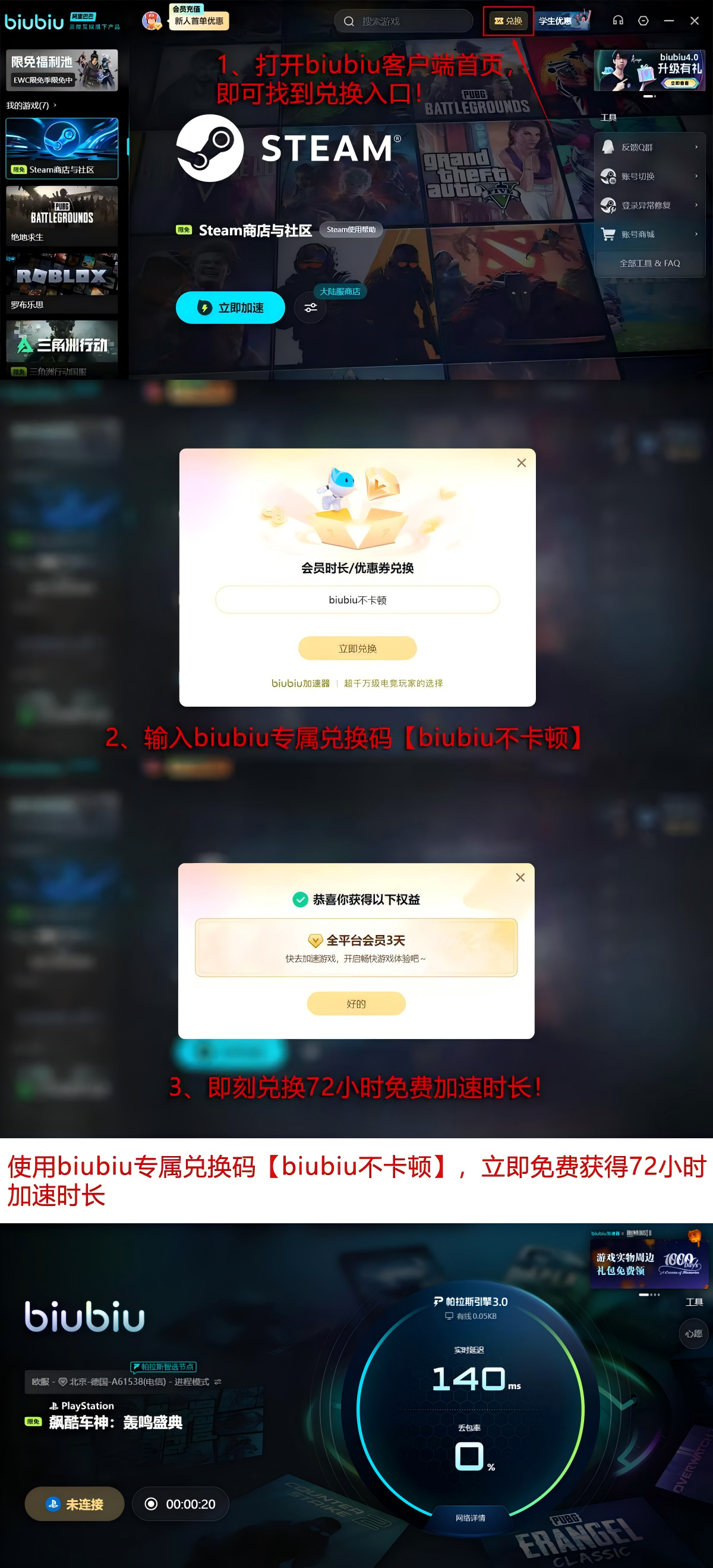 针对新用户实际使用需求,biubiu提供分阶段权益支持:完成首次账号绑定后,即可领取含24小时全游戏加速时长的新手礼包;叠加领取【biubiu不卡顿】专属服务,总可用时长提升至72小时;两项福利同步激活,最高可享连续96小时稳定加速体验。