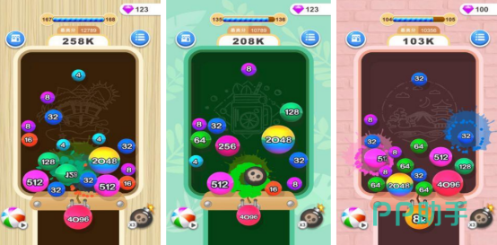 以圆润球体替代传统方块,整体画风清新明快,触感反馈柔和,具备较强情绪舒缓效果。顶部区域动态弹出带数字球体(如4、32等),玩家需预判轨迹并滑动调整落点,实现同数球体接触合并。界面左右下角配置功能型道具(如炸弹),用于清除障碍或重组布局,提升策略容错率。