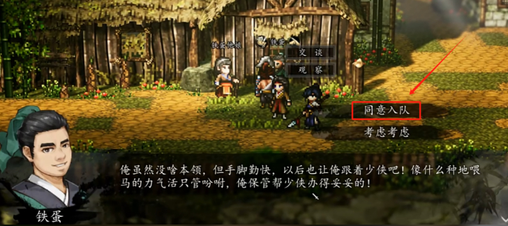 铁蛋入队需完成“异种金蝎”任务链:首先进入清河村,与铁蛋附近的母子对话触发解毒事件,此时铁蛋临时加入队伍;随后护送其前往洛村,由郎中魏老诊断确认为金蝎之毒,但其无力施治,建议寻姑苏城柳麻衣协助;抵达姑苏城后,在客栈周边找到柳麻衣,她提出需以三只活蝎子入药方可解毒。