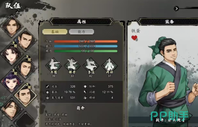 游戏前期可招募队友数量较少,铁蛋恰好填补前排坦位空缺。配合卫霍等输出型角色,他能凭借高体质与力量承担承伤职责,在清河村至洛村过渡阶段有效应对各类小规模遭遇战,大幅提升开荒容错率。