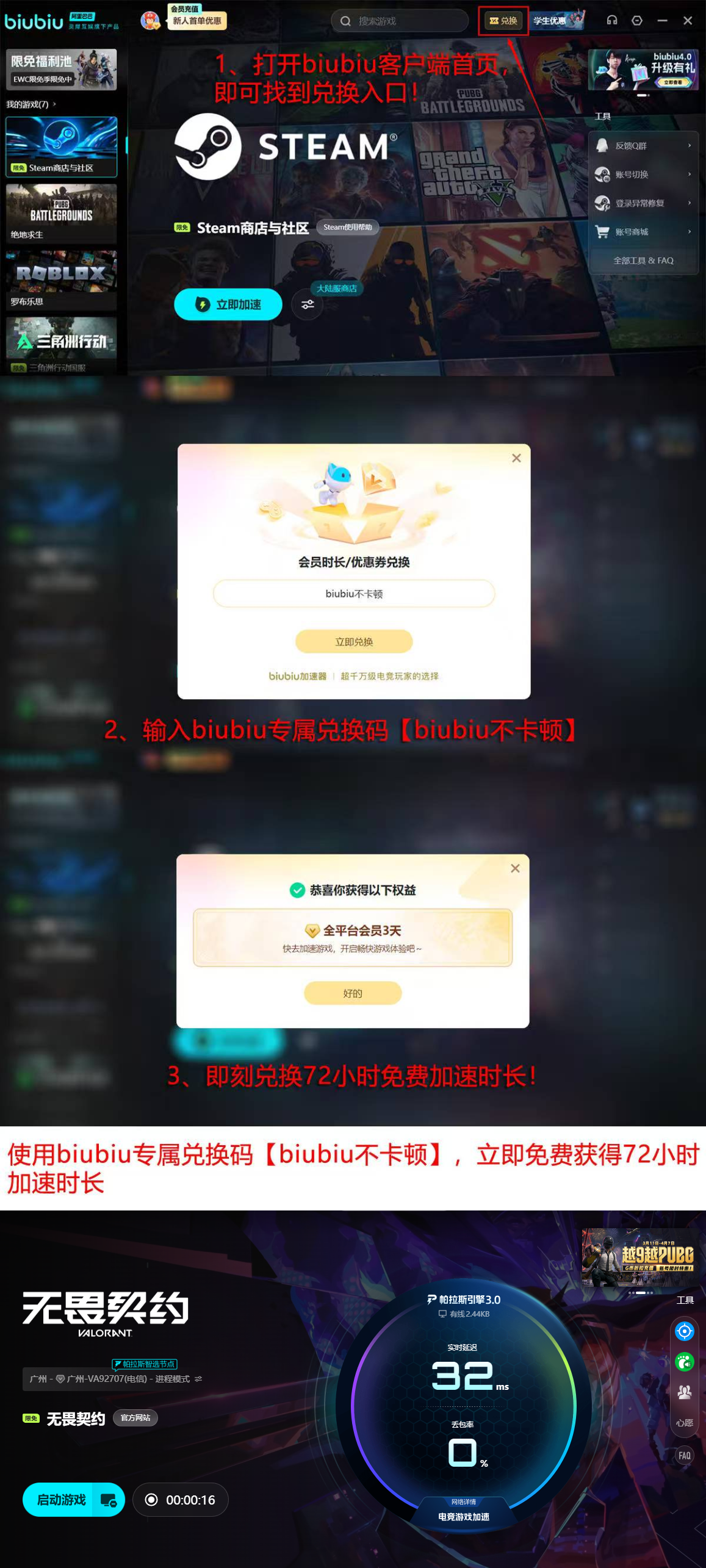 首次接触网络加速工具的用户无需顾虑上手门槛。biubiu加速器为新注册用户提供24小时全功能免费试用;若需更长体验周期,还可通过关键词【biubiu不卡顿】额外领取72小时加速权益,两项福利可叠加使用,充分验证实际效果。