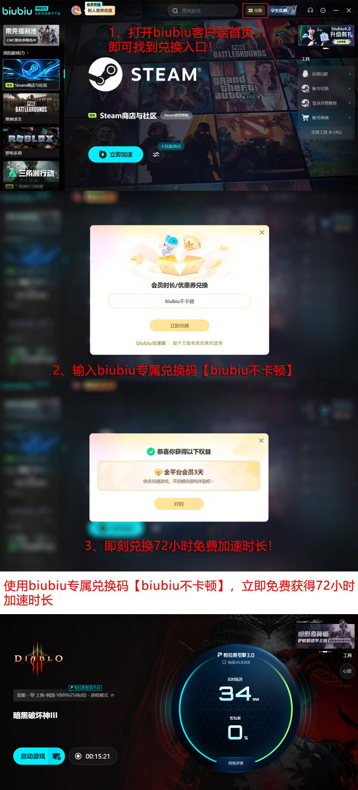 在用户权益方面,biubiu加速器提供切实可用的新手体验机制:完成注册并登录后,无需任何充值即可领取24小时全功能加速时长,便于玩家充分验证实际效果。同时,所有用户(含已注册账号)在客户端内输入兑换码【biubiu不卡顿】,均可额外获得72小时加速权限,累计达4天免费使用周期,大幅降低试用门槛。