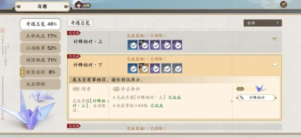 要解锁侠客叶知秋,要做完针锋相对·上/下奇遇,奇遇就会自动触发,跟着跑即可;