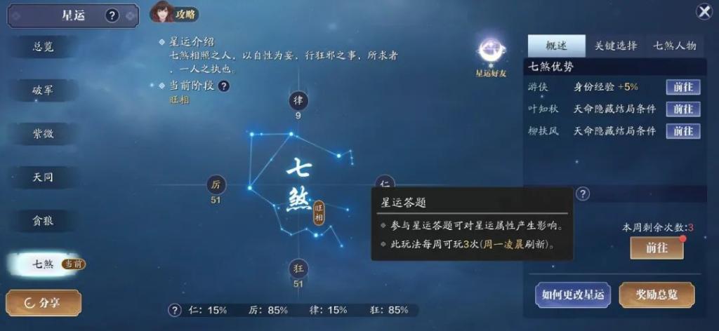 各位可经过星运解题和好感度里面的求运,改动自身的星运;