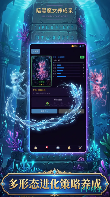 游戏世界设定于魔法能量失衡的危机纪元。大陆各处涌现大量敌对魔物,威胁城镇安危与生态平衡。玩家需通过契约仪式召唤初始魔女,并逐步解锁全部50+角色图鉴。早期获得的魔女多为基础形态,部分初始即呈现幼生魔兽态;随着培养深入,她们将经历多阶段进化——从弱小精魄成长为具备完整人格与强大力量的成熟魔女。每类魔女对应十余种元素类型组合,不同属性间存在克制关系,实战中需依据关卡机制与敌人弱点动态调整出战阵容。