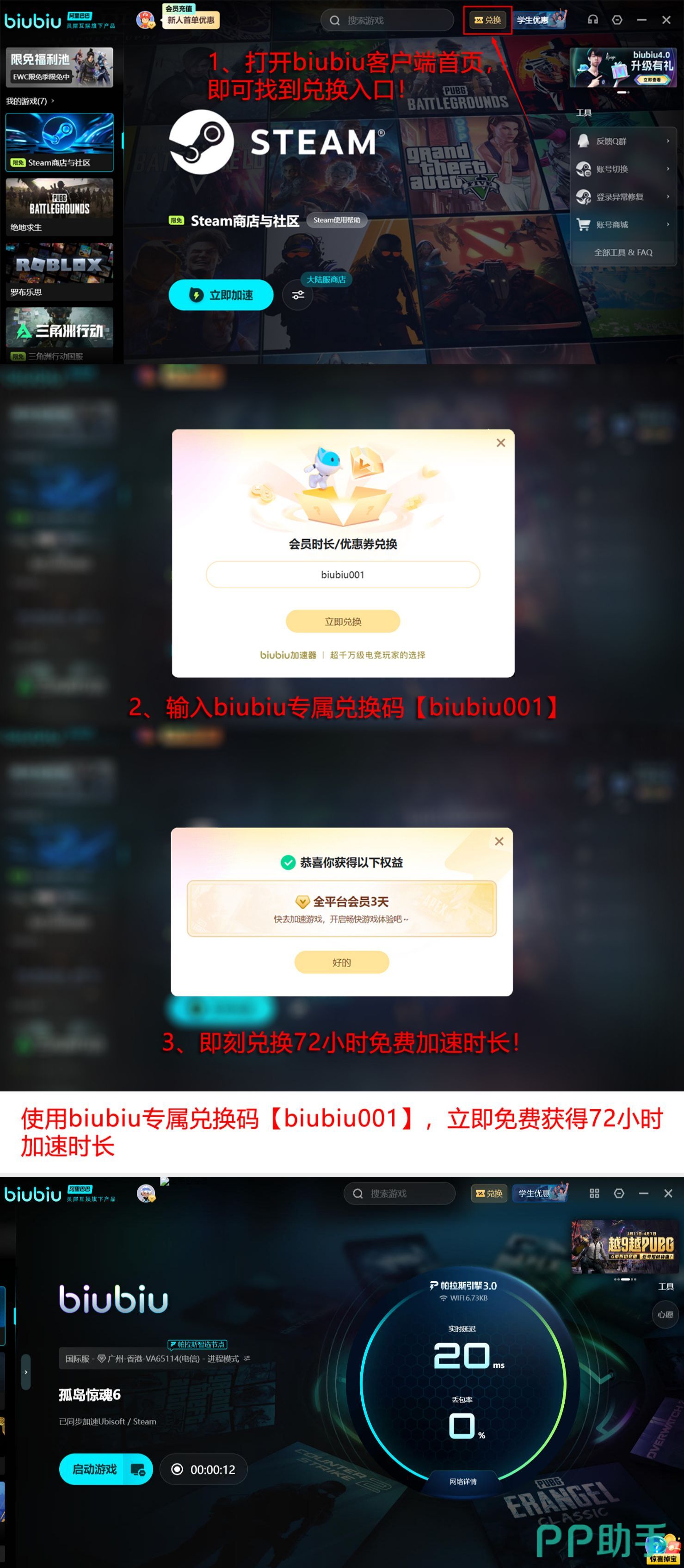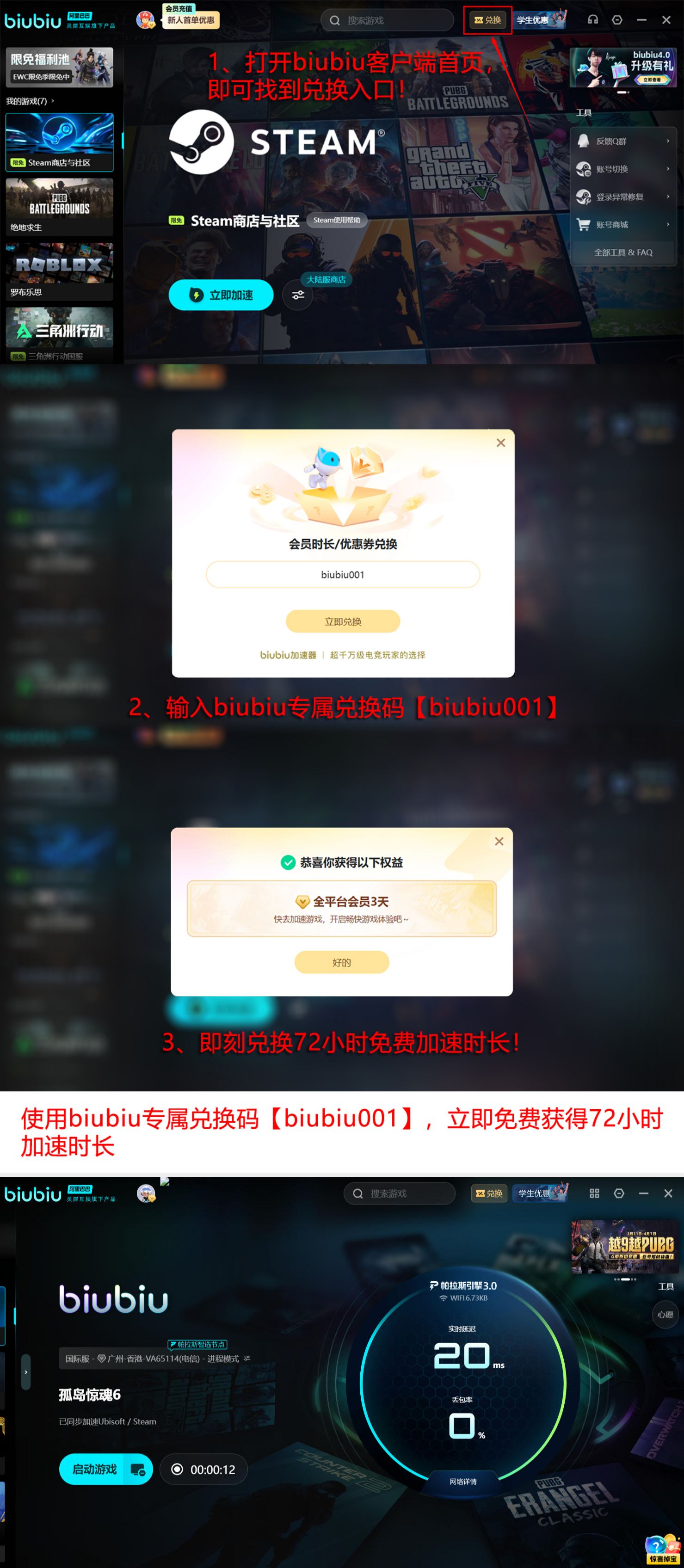 当前新用户注册即可领取24小时专属加速时长。另开启限时兑换活动:在加速器主界面“礼包中心”输入口令【biubiu001】,所有账号均可获赠三天加速权益,限兑一次。新用户叠加两项福利后,总计可享96小时无限制加速服务。
