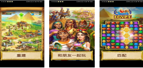 以古埃及文明为背景的竖屏三消作品。消除动画融入象形文字、圣甲虫、法老权杖等文化符号,UI界面采用金砂质感纹理与蓝青主色调,高度还原尼罗河流域视觉印象。关卡设计强调策略性匹配,部分节点需达成特定形状组合方可通关,兼顾美术表现力与玩法深度。