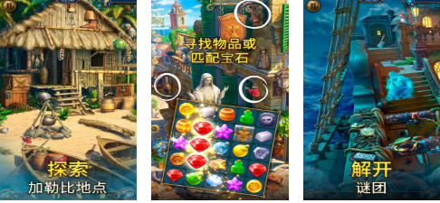 融合“找物+三消+密室逃脱”三重玩法框架。主舞台设定于加勒比海沿岸与夏威夷群岛实景地图,每处场景均含数十个可点击交互点位。三消环节嵌套在主线推进流程中,用于解锁关键道具或触发剧情分支,节奏把控成熟,兼顾烧脑性与休闲感。