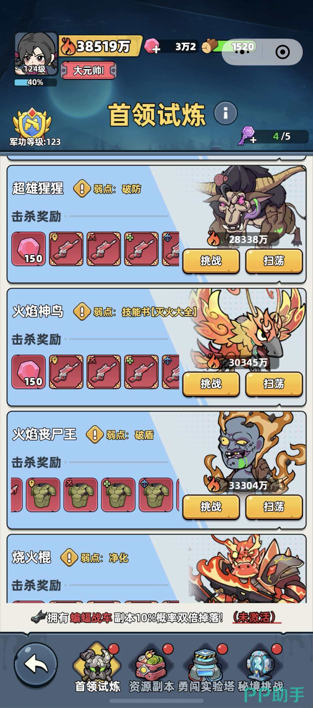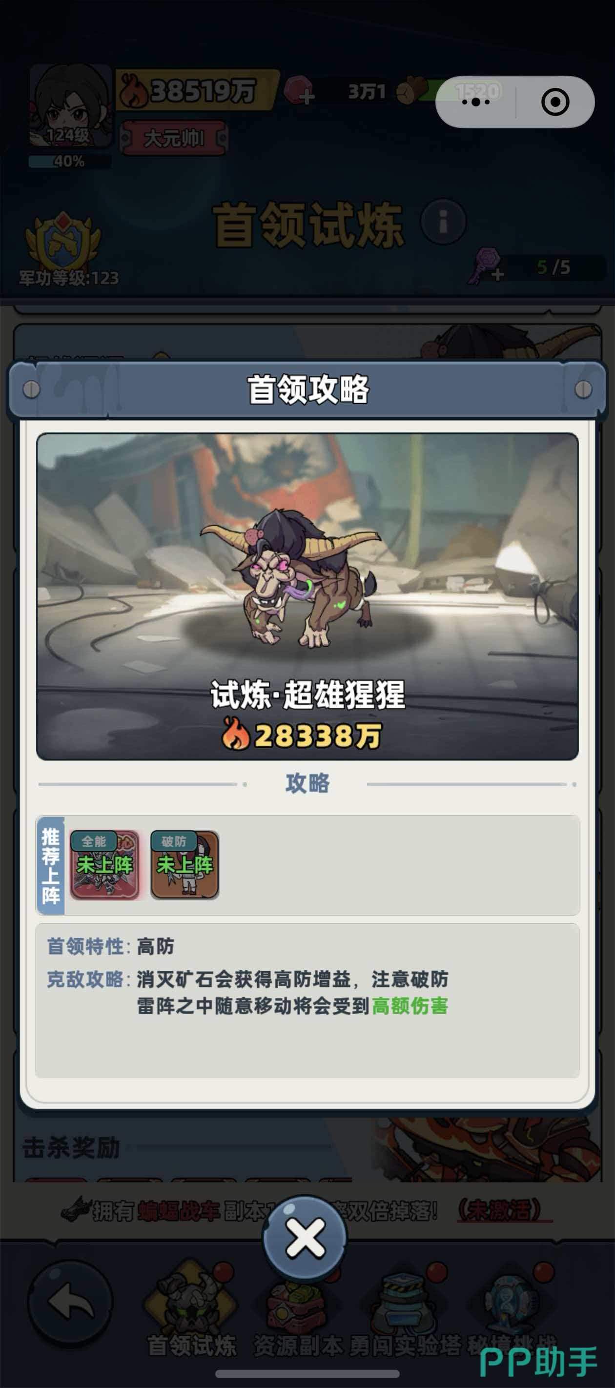 需要特别说明的是,“超雄猩猩”虽以“猩猩”为名,但其外观设计完全脱离灵长类特征——整体轮廓更接近重型牛型生物,躯干粗壮,肩颈肌肉虬结,头顶一对前倾锐角极具压迫感,口部外露的锯齿状利齿进一步强化了其凶戾气质。该BOSS当前战力值固定为28338万,属于挑战大厅中梯队靠前的硬核目标。系统明确提示:玩家仅在自身队伍总战力达到或超过该数值时发起挑战,方可保障基础通关可行性;战力明显偏低时强行进攻,失败概率极高。