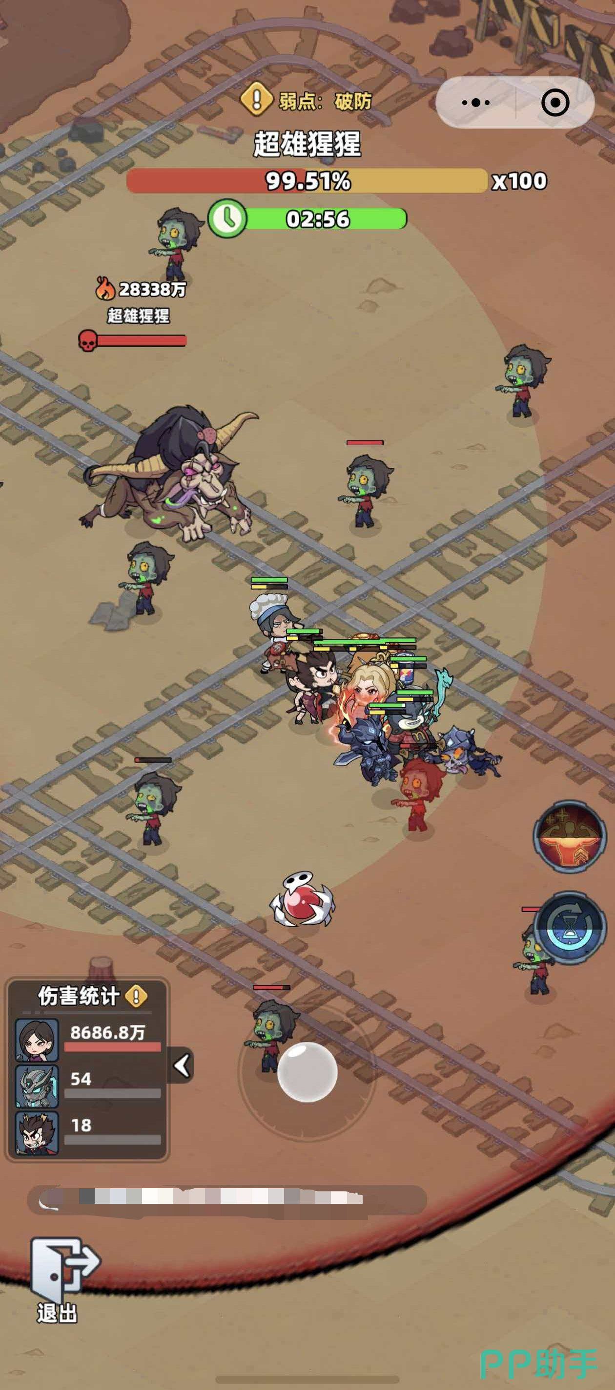 进入正式战斗阶段,超雄猩猩将依次释放两类关键技能:第一招为双环范围攻击,地面浮现内外两层同心圆判定区。若未能及时闪避,应果断站定于内圈中心或两环之间的缓冲带,以规避最大伤害。第二招为雷阵覆盖,当BOSS体表浮现流动蓝电网纹时,即为雷阵即将生效的视觉信号,此时须立即远离其身周区域。同时,战场中会持续刷新小型丧尸单位,击杀后掉落矿石资源,玩家需在保证安全的前提下迅速拾取,避免因遗漏矿石导致高防增益提前触发。