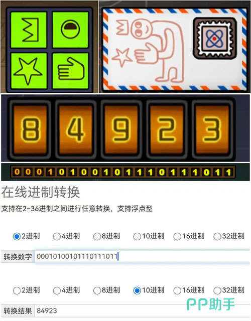 打开“人卡2”信封后,可解出“人卡7”图案谜题,获得“火柴”。用其点燃“人卡6”煤油灯。将“人卡8”显示的二进制数值转换为十进制,得出“人卡5”锁具密码:84923,开启后获取“硬币”。