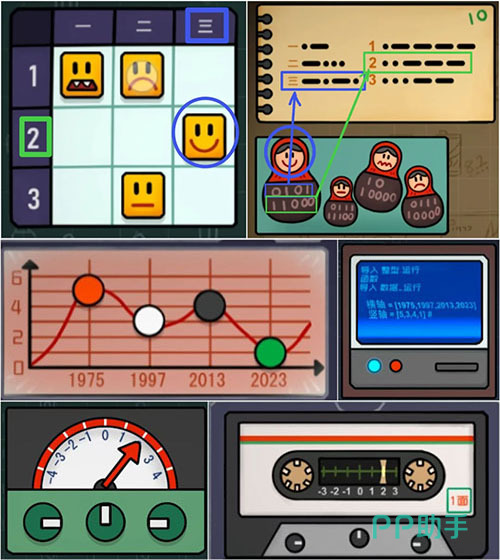 后续流程中,需定位带有“人物卡5”图标的时钟装置,解开其时间逻辑谜题后获得“人物卡6”。紧接着挑战5×5蓝色方格排列谜题,成功后取得“铁锤”。使用“铁锤”击碎“人4”外层石膏,取出“磁盘”,并将其装入“人3”电视接口。依据“人6”雷达界面提供的方位提示,进一步破解“人2”内部黄红双色坐标系统,获得“磁铁”。