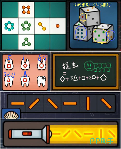 筛子平铺展开后构成新型拓扑谜题,解答后获得“黑板擦”。使用该道具清洁“人卡6”黑板区域,显现出关联“人卡3”的牙齿图形线索,并同步解锁“放大镜”。借助“放大镜”观察“人卡5”右下角符号板,经解析后获得“贝壳”。