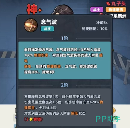 丸子头的平推能力非常强势,在这里通过自身的技能可以带来的优势,就是通过双重真伤带来更高的开局效率,目前在职业特性效果上面,她可以为自身的伤害数值带来25%左右的提升,而对于幸存者特性来说,在物理伤害数值上面是可以带来10%提升的,所以这方面都是双重的提升效果,这样丸子头在开局阶段的话,自身的输出能力就可以快速叠加起来,平民玩家如果拿到丸子头的话,培养她是目前性价比最高的输出选择,而另外她在自身技能效果当中,其实不同星级解锁的能力也不一样,初期可以解锁的战技叫做念气波,通过这个能力,可以进行起手操作,当然了其中有没有真伤能力是非常关键的,通过这个念气波,她可以造成一个直线距离的攻击,其中最大的范围是可以攻击到3名敌人,对所有的敌人造成的是180%的伤害,因为是物理攻击类型的角色,所以这里也是物理伤害数值。
