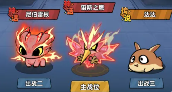 上阵的话大家要通过三个位置来进行搭配,在这里就建议大家不管是输出位还是增益位,都可以放自己喜欢的宠物,以及绝对是达到强度比较高的宠物,这里建议大家首选选用红色品质的神话宠物,神话宠物目前达到的基础数值也是最高的,另外如果没有红色品质的宠物,也可以用黄色,就是传说级别的宠物,这里大家在搭配的情况下可以先用尼伯雷根搭配宙斯之鹰,然后加一个达达,搭配成功的话,其中也可以看到他们技能效果当中附带了额外的伤害增益,然后尼伯雷根的话,大家如果觉得不好拿的情况下,也可以在前期放小翼,小翼在这里直接提升的攻击能力也是非常不错的,它一般是放在2号位,这里主要的宠物位置推荐给大家用的是尼伯雷根,它因为也是红色品质的神话宠物,所以比较难获取,但是它效果上面是非常好用的,可以给队伍带来足够的暴击概率。