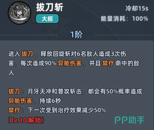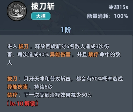 这里的拔刀斩其实就是学生妹的大招,这个技能在升级后会有更多的伤害次数以及倍率释放,而且在大家后期的触发概率都会一起提升,所以学生妹的实战效果不见得很差,拔刀斩这个技能会让学生表妹进入拔刀状态,此时就可以释放一次回旋斩对6名敌人造成3次伤害,每次造成90%异能伤害,并且其中也包括了禁疗命中的敌人,而在拔刀状态当中大家使用月牙天冲和普攻斩击招式的话,都会有所加成,其实体现在50%概率造成异能伤害,以及持续6秒禁疗效果上,这就让敌人下一次受到治疗的时候效果会减少50%。