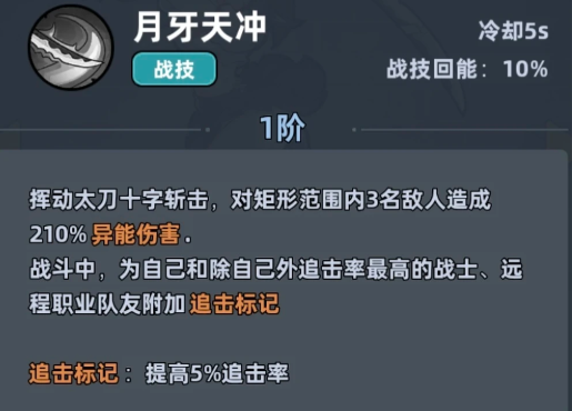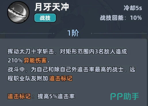 对战中的作用主要是针对输出类的角色,还可以限制敌方的回血能力,所以她其实上场的话自身的克制优势还是有的,只要对面有奶妈,大家就可以用到学生妹这一点特性带来更多的压制力而另外学生妹的主动技能叫做月牙天冲,释放的时候会挥动太刀打出一个十字斩击,这类斩击效果会对矩形范围内多名敌人造成异能类型的伤害,战斗中还能为自身以及追击率最高的战士、远程队友附加追击标记,直接提升 5% 追击率,让全队追击触发频率会提升很多。