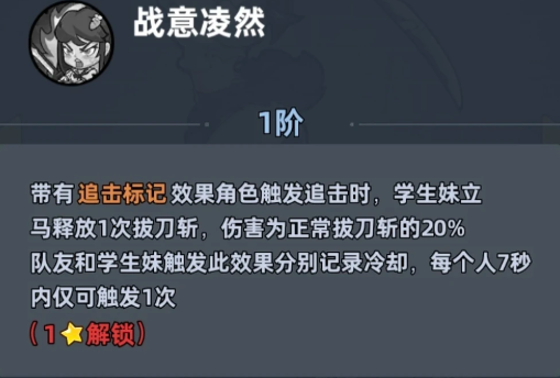 而在被动能力上面她可以用的是战意凌然,这个效果触发后只要是身上带有追击标记效果角色触发追击的时候,学生妹就会立马释放1次拔刀斩,伤害是平时正常拔刀斩的20%,而且在其中的队友和学生妹触发此效果分别记录冷却时间,这个效果还是其中每个人7秒当中只能用到一次的,所以根据她这样的能力来养成的时候,学生妹前期就能展现出新手适合的搭配价值,她的定位一般就是放在物理追击流上面比较适合,不需要承担主力输出,核心作用是通过追击标记来提升全队追击触发率,所以更加适配赛博剑圣之类的物理爆发角色,跟赛博剑圣一起配队的话只要触发追击就能让整体爆发伤害直接翻倍,这也意味着学生妹不需要太多的资源就能进行组队。