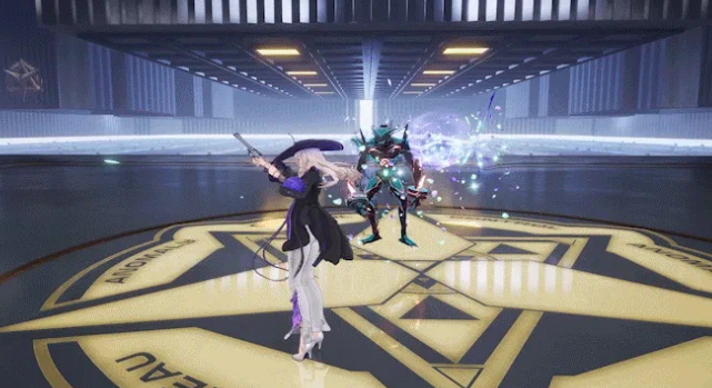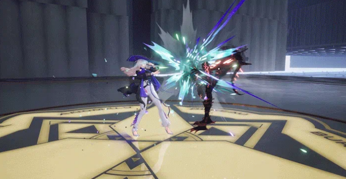 极限反击这边,触发极限闪避之后接普攻,九原会甩动双臂交叉射击前方的范围目标,同时对当前目标建立一次「致命玫约」,还能额外扣减一定的倾陷值,同时获得两颗「玫约子弹」。这个设计挺实用的,反击之后不只是造成伤害,还能顺便补充子弹资源。