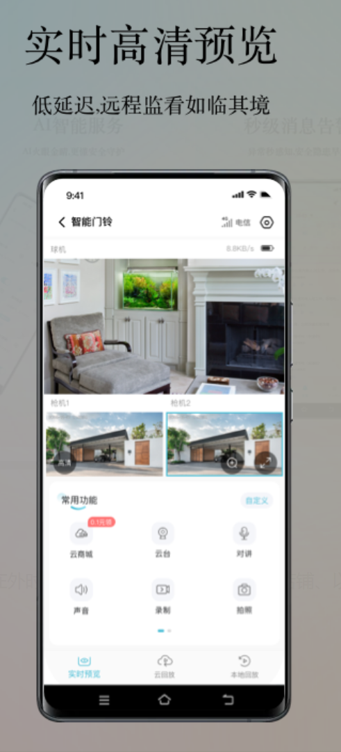 界面做得比较简洁,没有太多多余的东西,摄像机添加和管理的步骤也不繁琐。实时视频走优化编码,画面清晰度和流畅度都过得去,支持多视角切换,监控死角能减少不少。摄像头画面一有动静就立刻录像并推送通知,响应速度还算快。云存储和TF卡本地存储都支持,本地设备出问题了云端录像还在,两种方案可以按需选。