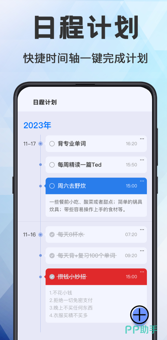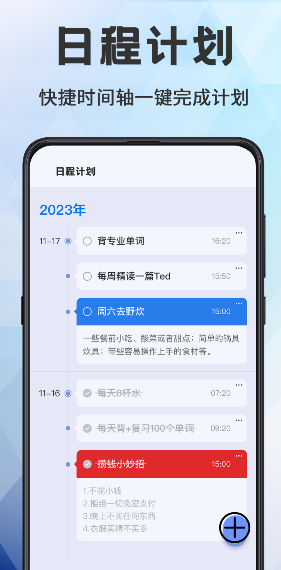 时间总是不够用,很多时候不是事情太多,是没排好顺序。四象限法则把任务按紧急程度和重要程度分成四类,拖拽就能调整优先级,该先做什么一眼看清楚。单日、三日、月视图、时间线视图都支持切换,配合象限视图,任务分布情况更直观。添加任务时自动识别日期和时间,不用手动调,提醒方式支持闹钟和推送通知两种。